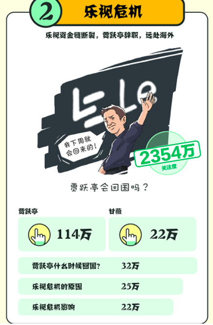 辞去职务远赴海外,旧日强盛的“乐视帝国”一时间呈现出大厦将倾之势。近来,北京证监局更向贾跃亭宣布最后通牒,责令其12月31日前回国。360查找年度科技榜显现,“乐视危机”重视度到达了2354万,重视贾跃亭何时回国的“吃瓜大众”远超过重视乐视危机原因及影响的网友,达32万。