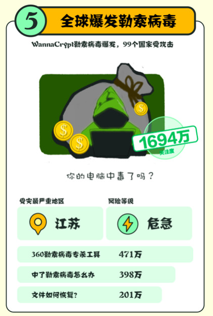 360查找年度科技榜显现,全球迸发勒索病毒事情的重视度高达1694万,上榜十大科技热搜事情,受灾最严峻的区域为江苏省,其间360勒索病毒专杀东西重视度达471万。