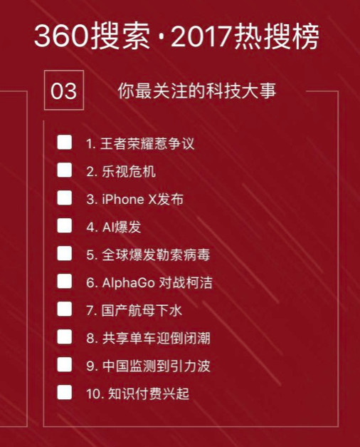 近来,360查找依托旗下360趋势大数据,制造并发布《查找·回忆2017——360查找年度热搜科技榜》,和网友一起回忆2017产生的科技大事情。数据显现,风行全网的《王者荣耀》、乐视危机以及iPhone X发布等成为科技热搜前三名,此外,AI迸发以及勒索病毒事情等也都榜上有名。