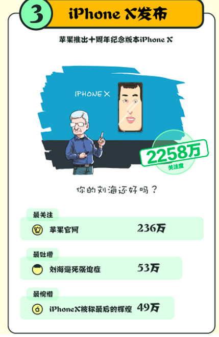 自iPhone X发布之日起,最受热议也最遭吐槽的,莫过于其屏幕正上方的“齐刘海”规划。为了平衡全面屏和手机功用,iPhone X不得不挑选在手机上方留下一道黑边区域,即网友所吐槽的“齐刘海”,不过“刘海”虽雷,但功用不小,这儿调集了红外摄像头、间隔传感器、环境光传感器、扬声器和前置摄像头号。尽管如此,网友们仍是不能中止恶搞“齐刘海”,不少人将“刘海”P上政要明星的脑门, “齐刘海逼死强迫症”也撒播各类文章,有槽点证明有极高的重视度,榜单显现吐槽iPhone X“刘海”的强迫症有53万之多。
